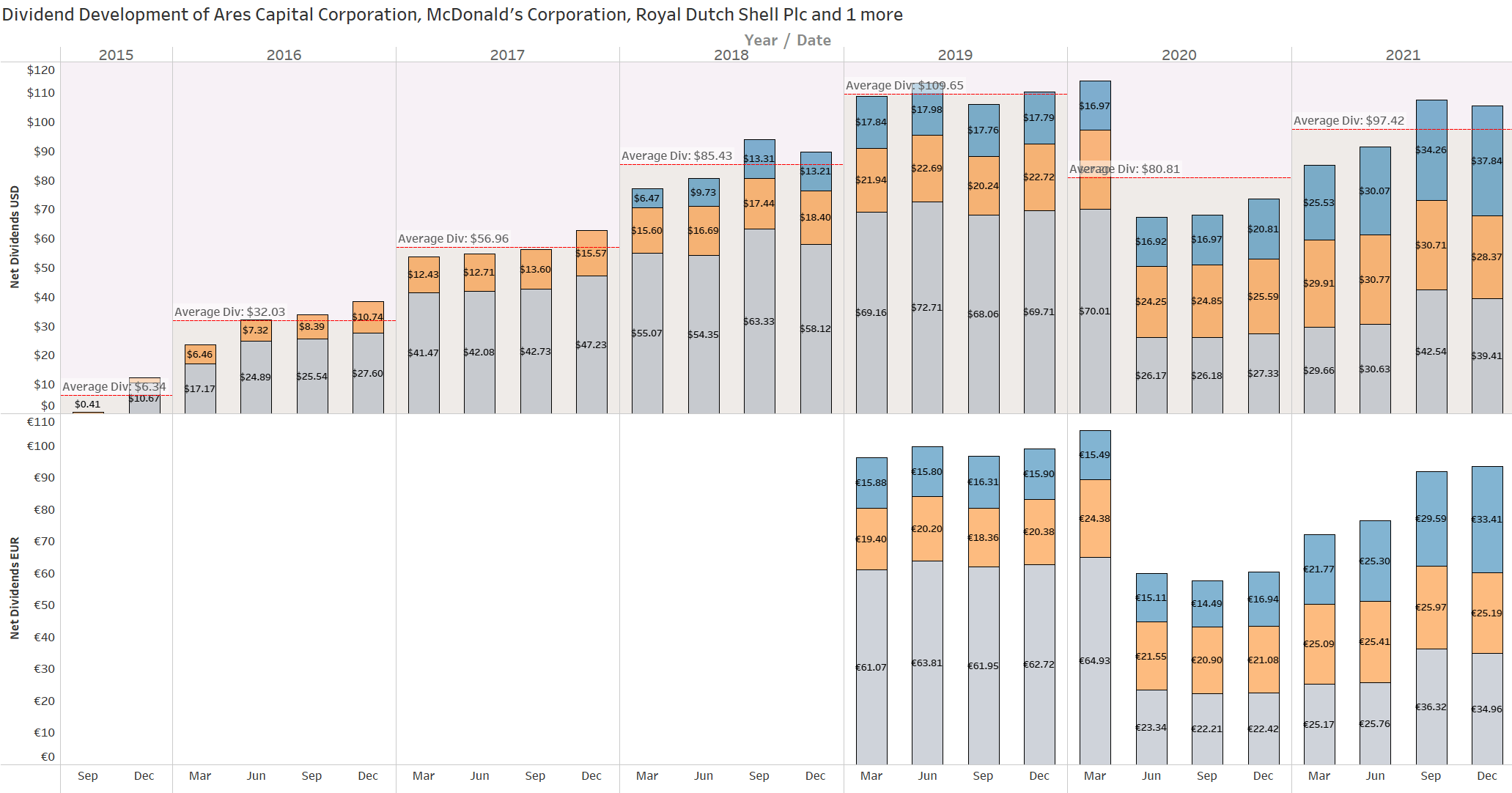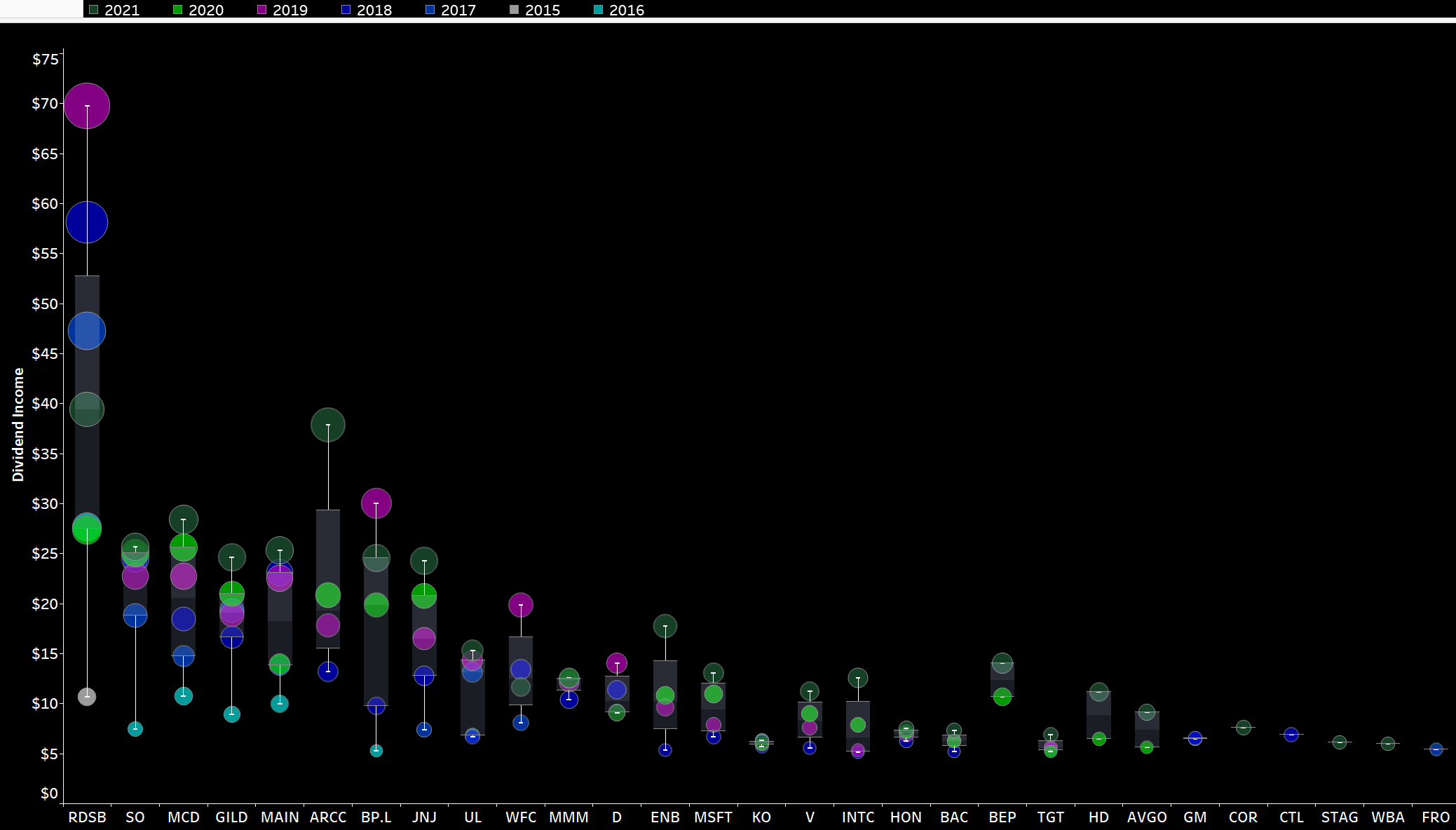 This view looks very cluttered at first, but it is very rich in information. It shows every single dividend payment I have received since I started my journey in 2015 in the shape of a circle colored differently by year and size, based upon their contribution. The view is broken down by month and by year (not by year and by month), and thus allows to better see the development over time. For every year of a certain month, a white rectangle indicates the average monthly dividend. The area where dividends fall below that average is filled dark red, whereas the area above is colored dark green. Personally, I absolutely love this redesigned view of my old “bubbles chart,” as it is much clearer to identify developments and trends in my dividend income.