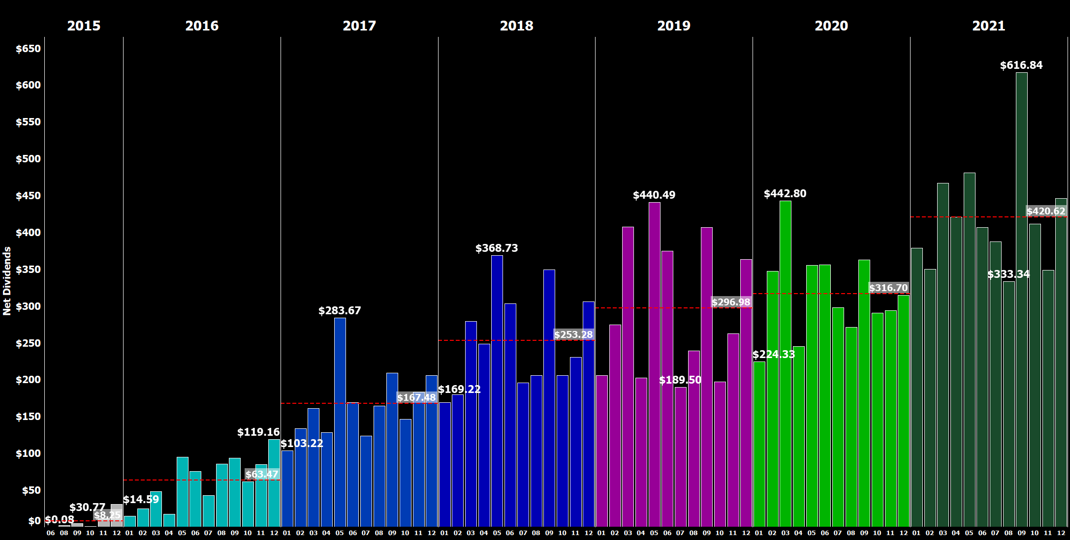 Here is a look at my favorite chart: the net dividend income development by month over time between 2015 and 2021, where you can easily see the development of my dividend income as well as the average annual dividend in a given year: